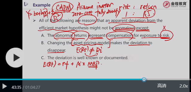 B不属于市场异常的表现。因为我们有很多模型来分析资产收益率,例如一级组合中学习的单因子模型market model (Ri=αi+βiRm+ei),我们在找资产收益和市场组合收益之间的关系,如果ei不为零,说明有异常收益,有这个模型解释不了的收益。但是,将market model 换成multifactor models多因子模型,之前ei可能消失,被更多的风险因子解释。