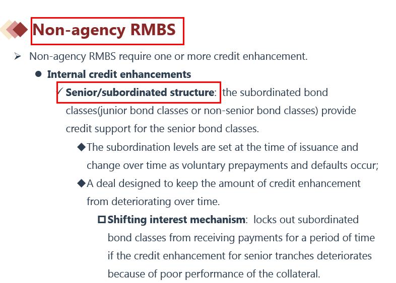 同学你好,这里A选项Senior/subordinated structure指的是信用增级的的一种方式,non agency RMBS会进行信用征集,见下图讲义。为乘风破浪的你【点赞】👍让我们知晓您对答疑服务的支持!~
