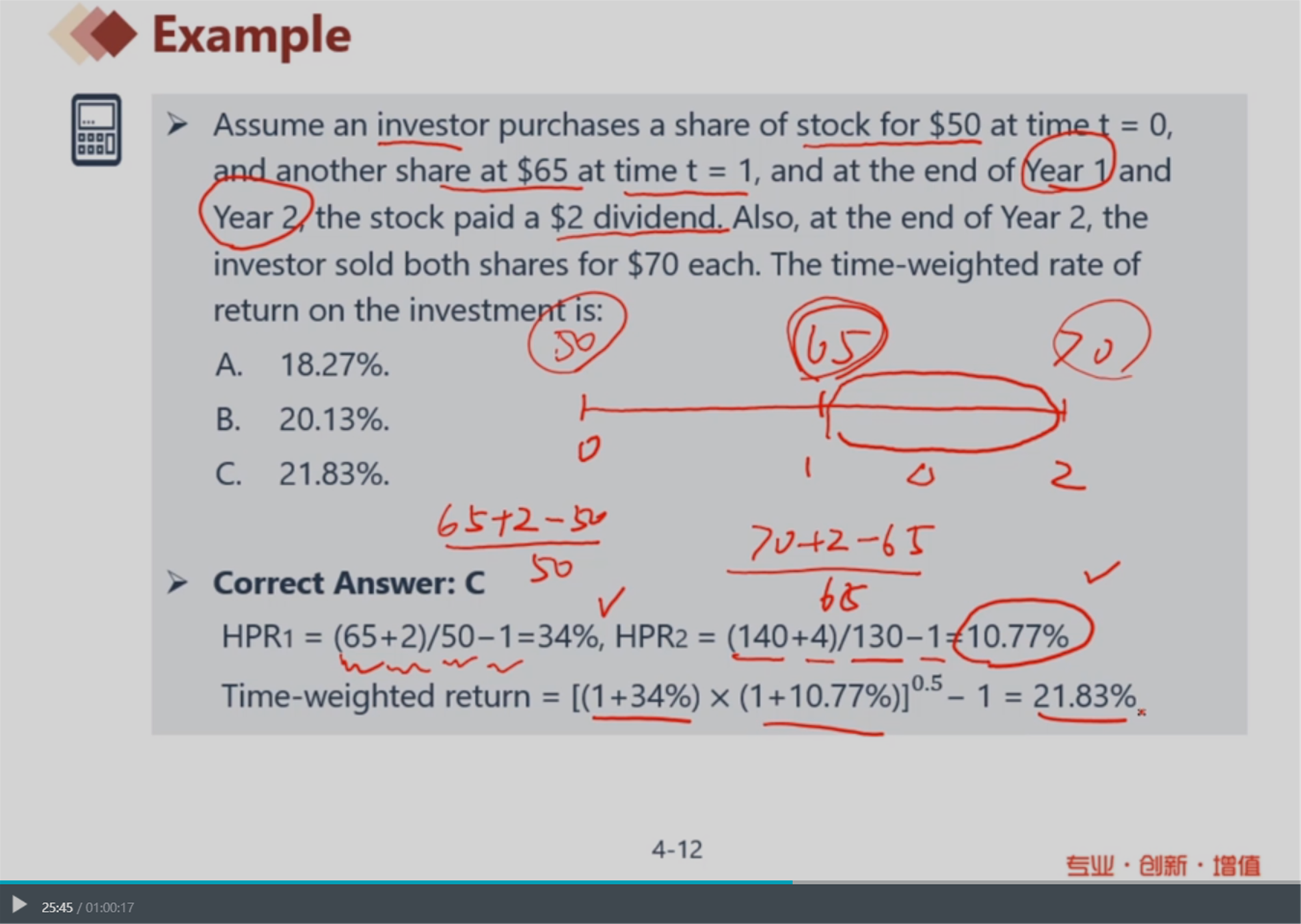 截图题目中要求的是TWRR,它是一个时间加权的年化收益率,TWRR的计算公式中是由HPR组成的,HPR是一个非年化收益率。