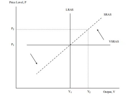 比如下图中,价格从P1涨到P2,那么你就不会大量增产,这样就会导致SRAS更加陡峭,那么它和P2的交点就会减少,越陡峭则Y2越靠左。