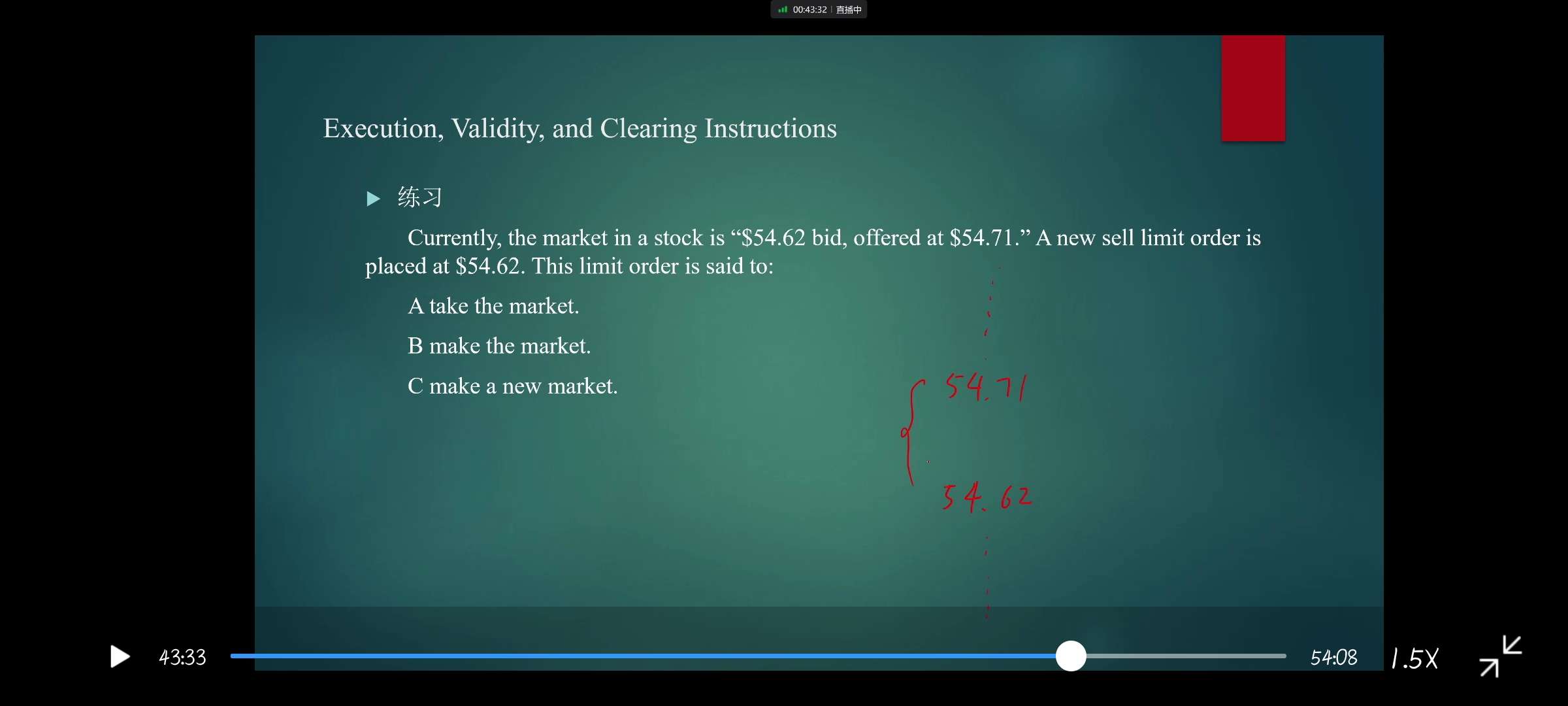 可以根据定义判断,现在的bid-ask范围是54.62-54.71,给出的limit order为54.62,因此是Make the market。