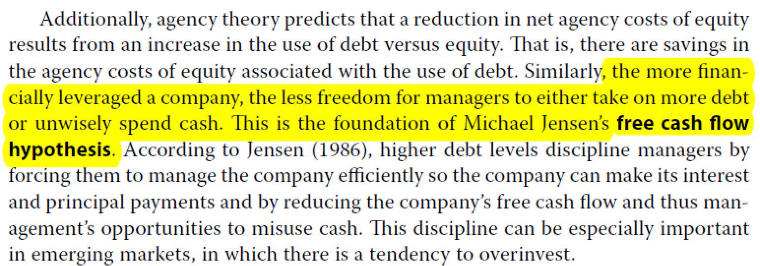 见截图,其实这个理论和我们在课堂中讲述的增加债务减少代理成本的理论是相同的。