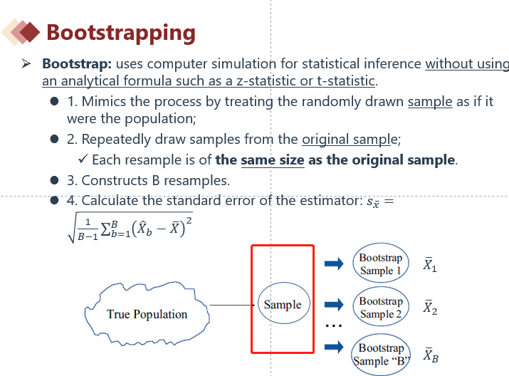 如讲义截图,我们用bootstrap resampling method,将“样本(红色框)”假装是“总体”,从红色框抽出更多的样本。
