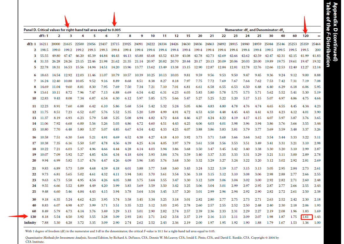 F分布表头“right tail”说明单尾概率查表,单尾概率对应本题的1%/2=0.005