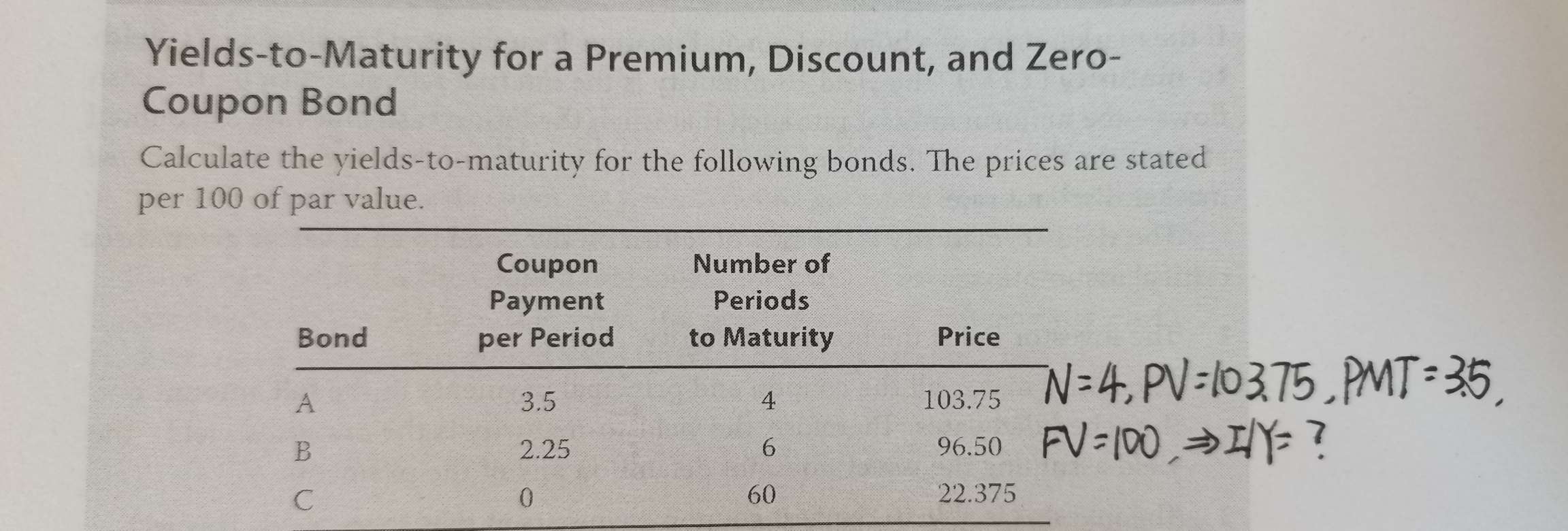 N=4, PMT=3.5, PV= -103.75, FV=100, CPT I/Y=2.5