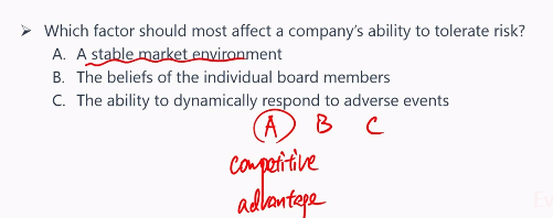 C是正确的。如果一个公司有能力迅速适应不利的事件,则可能具备着更高的风险容忍能力。
