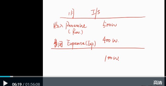 营收是一家企业的营业额(收入),是income statement利润表中的第一项,也就是老师板书中的“revenue”