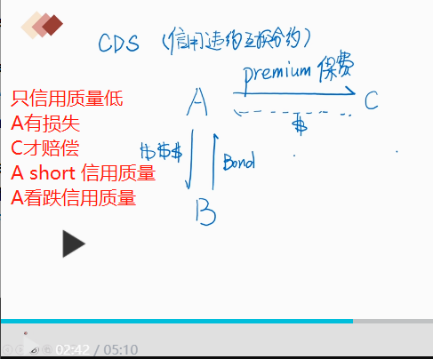 如以上截图,A担心未来损失风险,买了CDS(buyer of CDS),卖出了risk(将风险转移给了B)