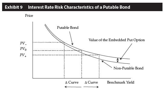 换个角度,如果是putable bond也存在一样的问题.- Putable bond=option free bond + put option.所以当利率下降时,债券价格上升.option free bond上升,此时不容易会提前行权,因此,put option的价格是下降的,因此,Putable bond的上升幅度会更小.而当利率上升时,债券价格下降.此时option free bond下降,此时容易行权,因此put option的价格上升,因此,Putable bond 的下降幅度也更小. 但是老师说过,利率下降的时候,Putable bond应该较pure bond变化更大一些.似乎对不上.