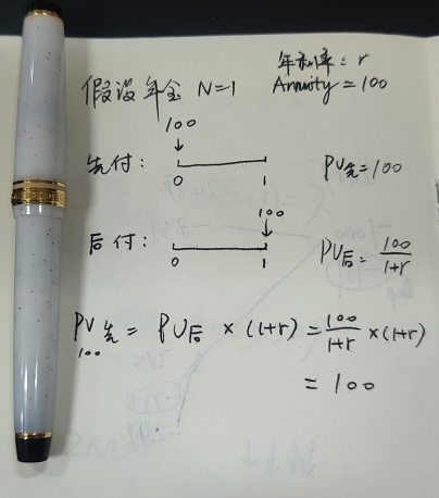 请参考附图,我们举一个简单的例子,说明先付和后付年金的现值关系