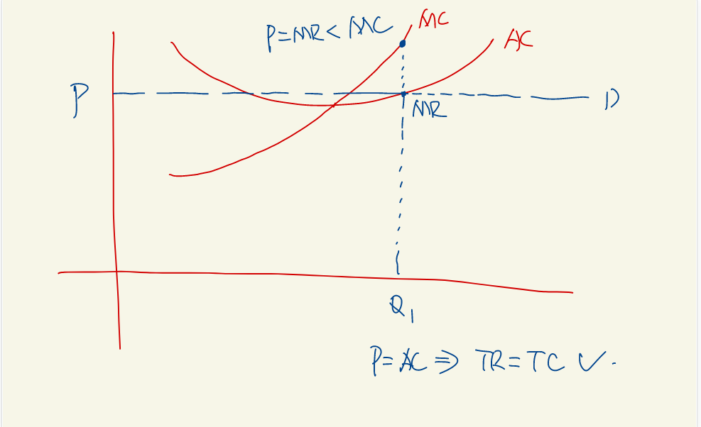 你看图中,P和AC相交点,满足TR=TC,此时Q的量在MC线上的交点高于AC和P的交点,说明在当前的Q下MC>AC和P,又因为P=MR,说明MC>MR , 满足题意。