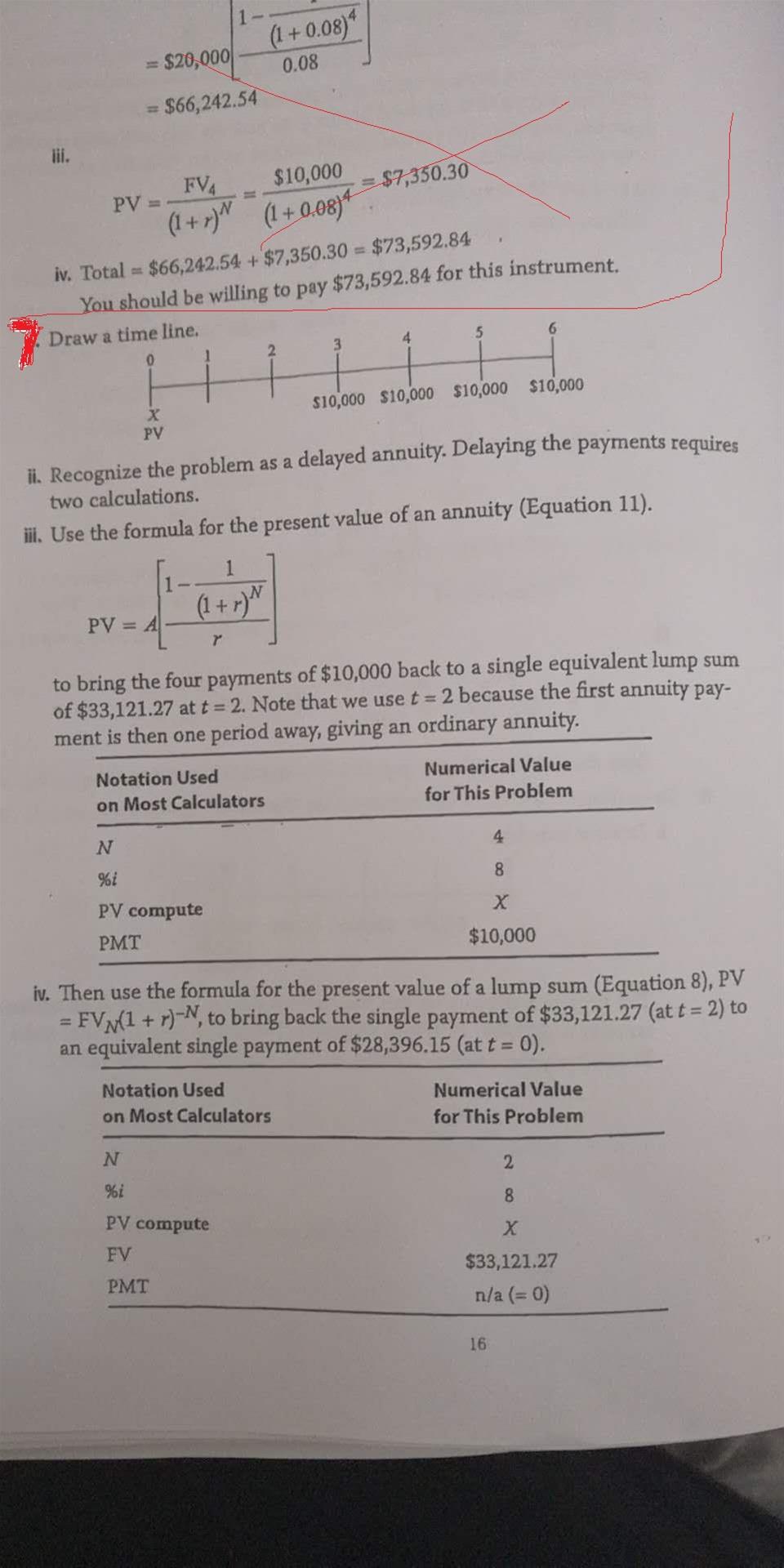 同学你好,我给你总结几点年金的要点吧,第一,折现,肯定是根据现金流开始的时间来折现,比如说从第一笔现金流从三年后开始,那就是先折现到三年后的这个时间点,然后再往前折现三年;第二区分先付后付,如果题目没讲,一般都是后付年金,题目提到了什么beginning或者是now之类的那就是先付年金,注意学费租金这类是属于先付年金的;第三,计算方式,你可以不用根据原版书的来,原版书因为不是用计算器方式而是列式子,所以基本上都是有些转换的,先付转后付,所以你就直接按照前面两点的取判断,然后用计算器那五个键来求年金,实在看不出来画现金流量图;第四,需要算两步以上的年金一定要用同一个方式来算,先付就一直都是先付。