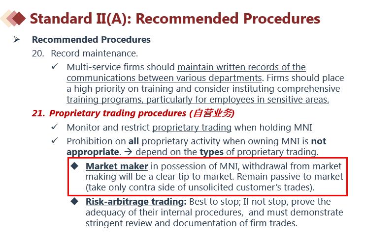 Market making做市商交易:拥有标的公司的重大非公开信息时,做市商不得停止做市,应该消极对待市场(remain passive to market),也就是参与者买,做市商卖,反之参与者卖,做市商买。也就是继续交易不违反。