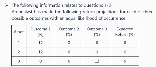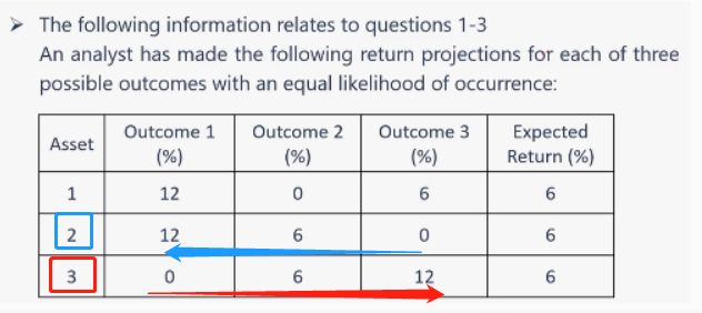 老师,这道题是只能用计算器算correlation才能得出结果吗?感觉很费时间。但是官网的解析我有点不懂,官网说Asset2和3对于outcome2的回报是一样的,但是outcome1和3完全相反;但Asset1和2在outcome1也是一样的,在outcome2和3完全相反。如果按解析的思路应该怎么判断呢?