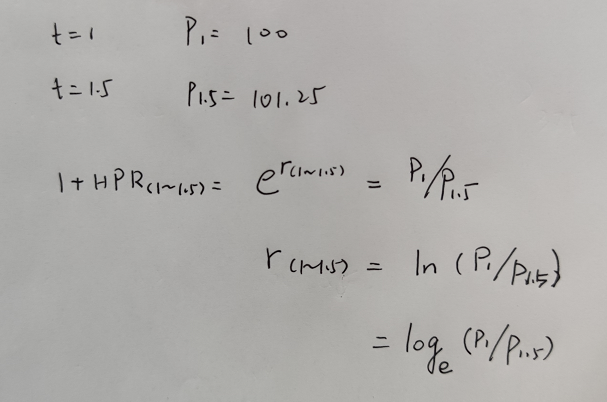 The continuously compounded semi-annual return for the period t=1 to t=1.5 is closest to:他不是让求连续复利的EAR吗。我当时想100和101.25.这个就是真实的年利率,那不就是A吗,就选了A。但如果是B的话,应该就是指1.0125是实际的,e^x=1.0125,要求名义利率x。所以是ln1.0125.是不是第一个想法哪里出现了问题。