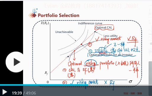 ②视频里面说,optimal CAL与IC线相切,optimal CAL线就包含了risk-free asset和risky asset?这个又该怎么理解?