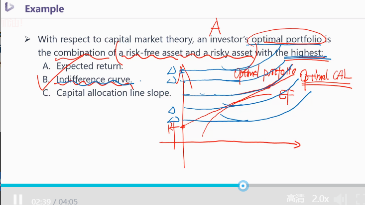在CML/optimal CAL(客观世界线)上方的所有点(如下图视频截图所示红色直线上方),称为“unachievable point”不可达到的投资组合点,代表客观世界无法提供投资者的投资组合