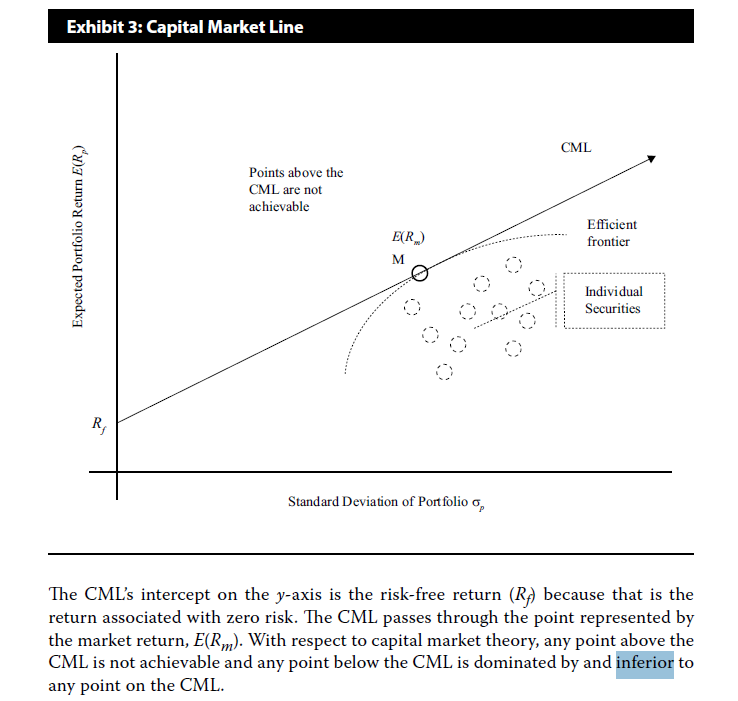 在CML/optimal CAL下方的所有点(如下图视频截图所示红色直线下方),称为“inferior point”,代表客观世界可以提供投资者的投资组合但是这些投资组合不是最优的投资组合