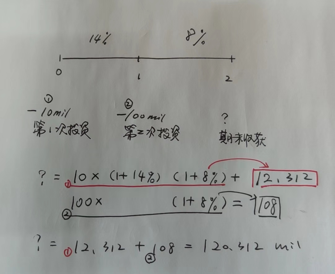 其中10x14%就是10mil经过一期投资之后的收益,这个收益没有取出来,参与了下一期的投资