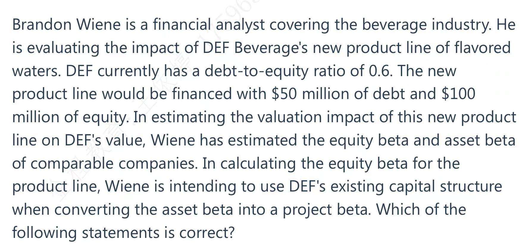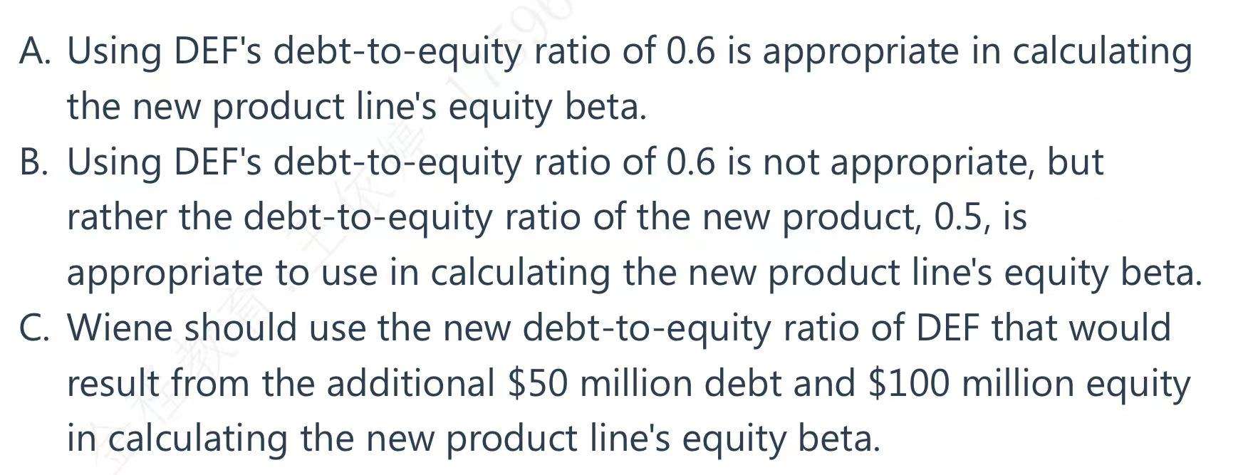 但是此题不需要我们计算,是要考察我们要是计算新产品的equityβ需要用到哪个D/E ratio