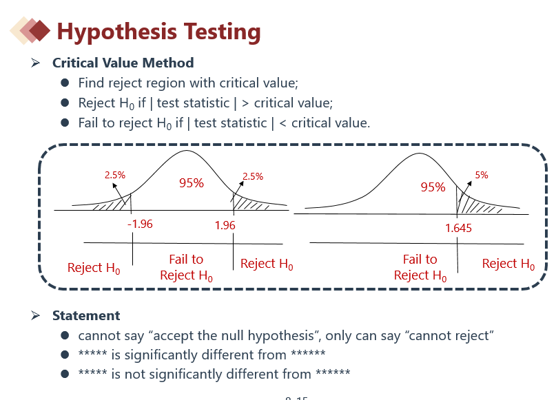 如下图左边双尾检验图所示,我们可以描述:当原假设为真时,有95%概率,总体均值落在空白区域
