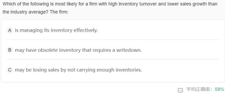 老师还有个疑问。关于下面这道题。high inventory turnover and lower sales growth than the industry average。就是COGS高,inventory低。正常情况下sale多了,也就计入COGS多。但因为lower sales growth,所以说明卖的少,而是通过其他方式计入的COGS,B选项,因为减值的多,那存货减值的部分计入COGS高,inventory减值低,都减值了sale的也少。B错在哪里。这个分析思路有什么错的吗。