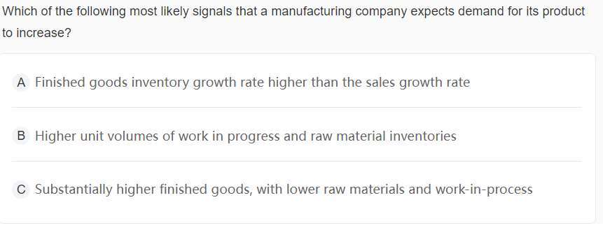 还有个这道题。从经济周期的角度能知道是B,但是光从读题上理解,A选项来看,我生产出来的存货比销售收入增长的多。那我为什么要生产那么多产品,总不能是无缘无故的生产吧,就是预期未来市场上的需求多,所以才生产啊,从这个逻辑解释A错在哪里呢。是不是哪个点判断错了