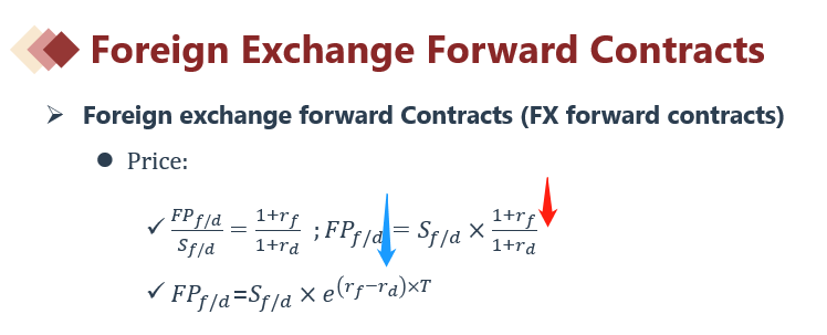 Mexico国家的利率将来(upcoming meeting)下降了50bp(1bp=0.0001,这个数值不重要,重要的是Mexico利率下降了),rf下降,于是(如下图所示截图公式)红色箭头引起蓝色箭头,USD未来市场价格将会下降(较低)