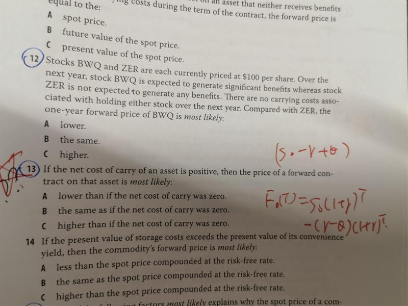 原版书课后题13题(见附图)应该选A,因为net cost of carry为正,charge成本抵减收益,抵减了一个正数,FP小于SP