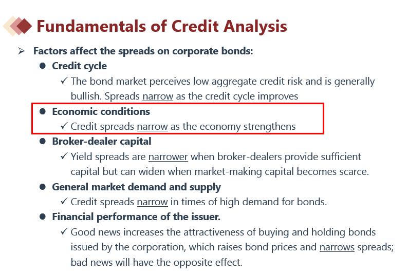 当经济不好的时候,spread是变大的widen,因为当经济不好的时候,风险是比较大的,此时需要给与投资者更多的补偿,因此收益率上升,意味着spread变大。见下图讲义。