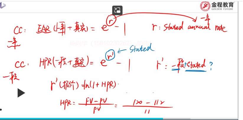不写HPR也是可以的,e^r=P1/P0,那么r=Ln(P1/P0),板书写HPR的目的是方便大多数我们学员理解e^r=1+HPR=P1/P0,那么r=Ln(1+HPR)=Ln(P1/P0),