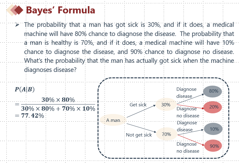 全概率公式会涉及2个事件(例如:真的生病和机器检测生病)如下截图我们讲义上的例题