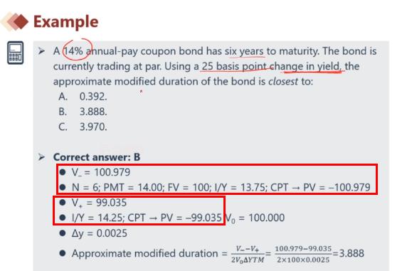 见下图解析,I/Y进行了变化,上下各变动25 basis point (I/Y=13.75和I/Y=14.25),带入计算器进行计算债券价格。