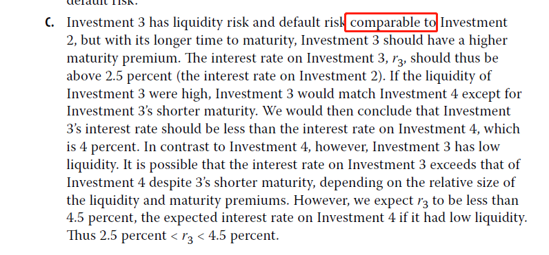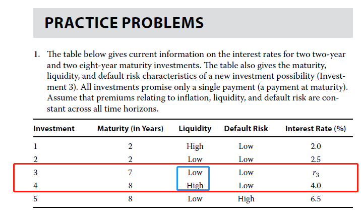 (1)答复3,为什么会因为Investment 3与Investment 4相比,有更差的liquidity,所以就需要加个0.5%的流动性风险溢价?教材P40第1题表格中Invetment 4对应的interest rate 4%不是已经考虑了Investment 3流动性较差的因素了吗?另外,0.5%流动性风险溢价是怎么得出的?