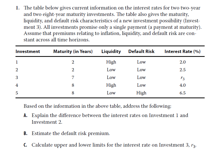 教材p45-1.C.-Solution-(1).为什么Investment 3相比Investment 2,有liquidity risk 以及default risk? (2)另外,为什么因为Investment 3 longer time to maturity, 会造成Investment 3有更高的maturity premium? (3)倒数第二行,为什么Investment 4的expected interest rate是4.5%?为什么r3的区间(2.5, 4.5)而不是(2.5,4.0)?
