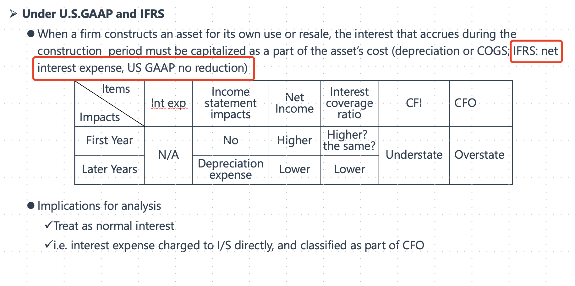 只有在国际准则下可以抵扣资本化的利息 如果是美国准则下,资产负债表中确认资本化的利息费用140million,10的收入计入利润表哈。 老师,这部分是在哪里讲的?可以把讲义截个图嘛