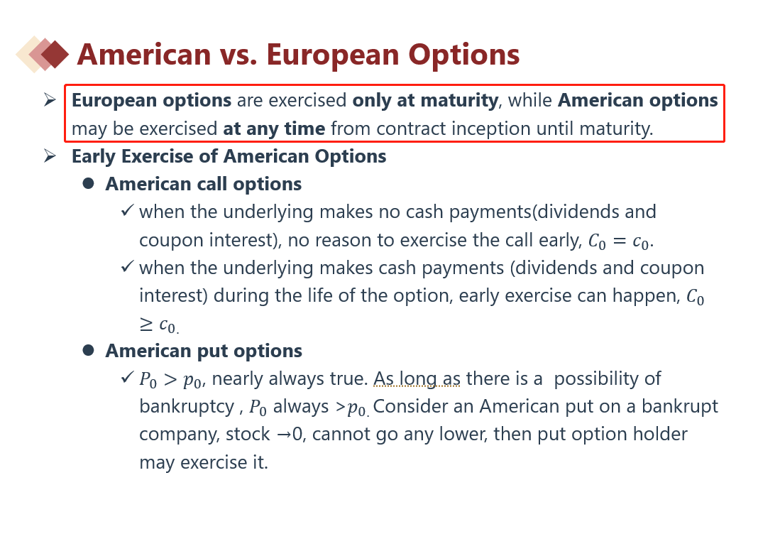 你好,见下图,欧式期权只能在到期日行权,美式期权可以在到期日前的任何时间行权。