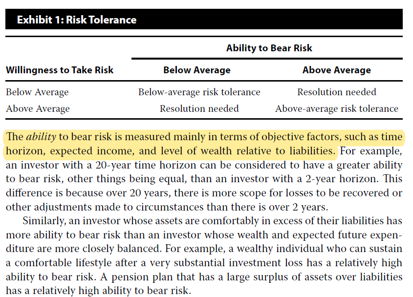 原版书描述:承受风险的能力主要根据客观因素来衡量,如时间范围、预期收入和相对于负债的财富水平。