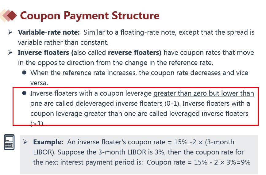 杠杆在0到1之间的叫做deleveraged inverse floater,杠杆大于1的叫做leveraged inverse floater。