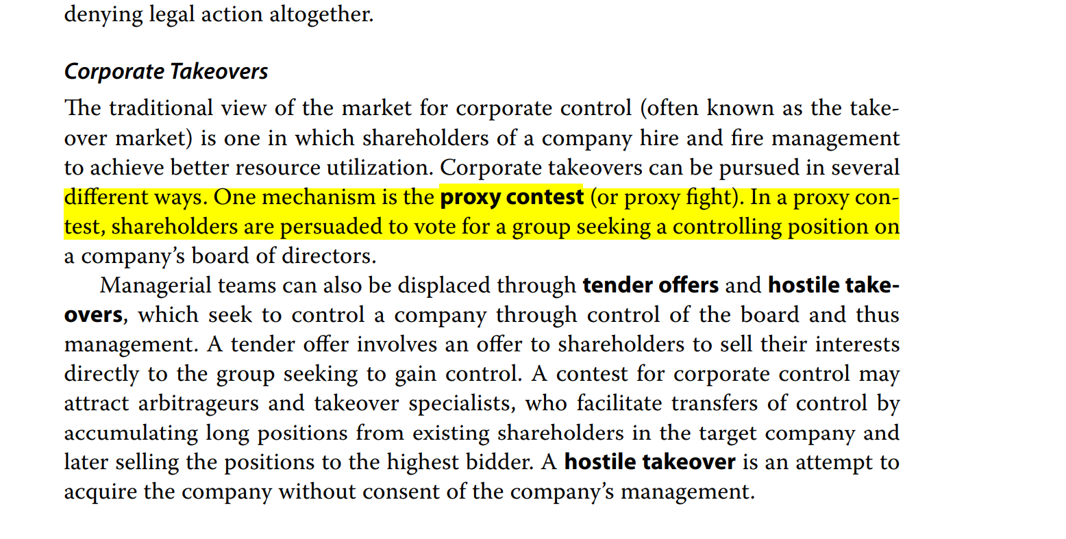 B选项的proxy contest代理权争夺指的是收购者劝说公司股东对自己的控制权的争夺进行投票;