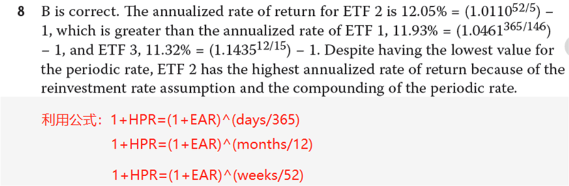 这个题目涉及的是HPR和EAR的转化,体现在两个利率的“时间”转化。HPR非年化收益率,而EAR是一个年化收益率。