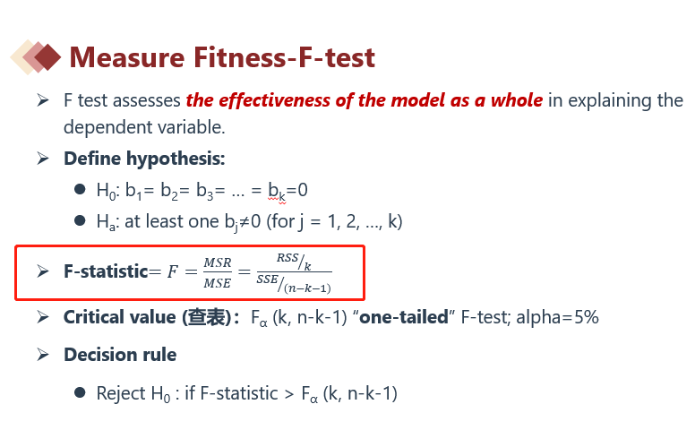 如下图,F检验对多个斜率是否为零检验,如果是单元回归,F检验是对为一个斜率检验。