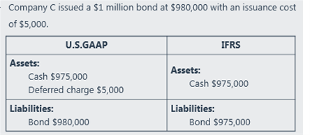 同学你好,从下面这个例子可以看成issurance cost 美国准则它是不扣全部在liability,IFRS是要扣除的,所以终止确认债务的时候,美国准则就要扣除,而IFRS不用,因为之前已经扣掉了。