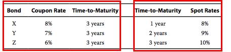 第二个表中的time-to-maturity意思其实就是time,时间的意思,也就是第一年,第二年,第三年。也就是对应时间的spot rate,实际跟XYZ三个债券不是对应关系。