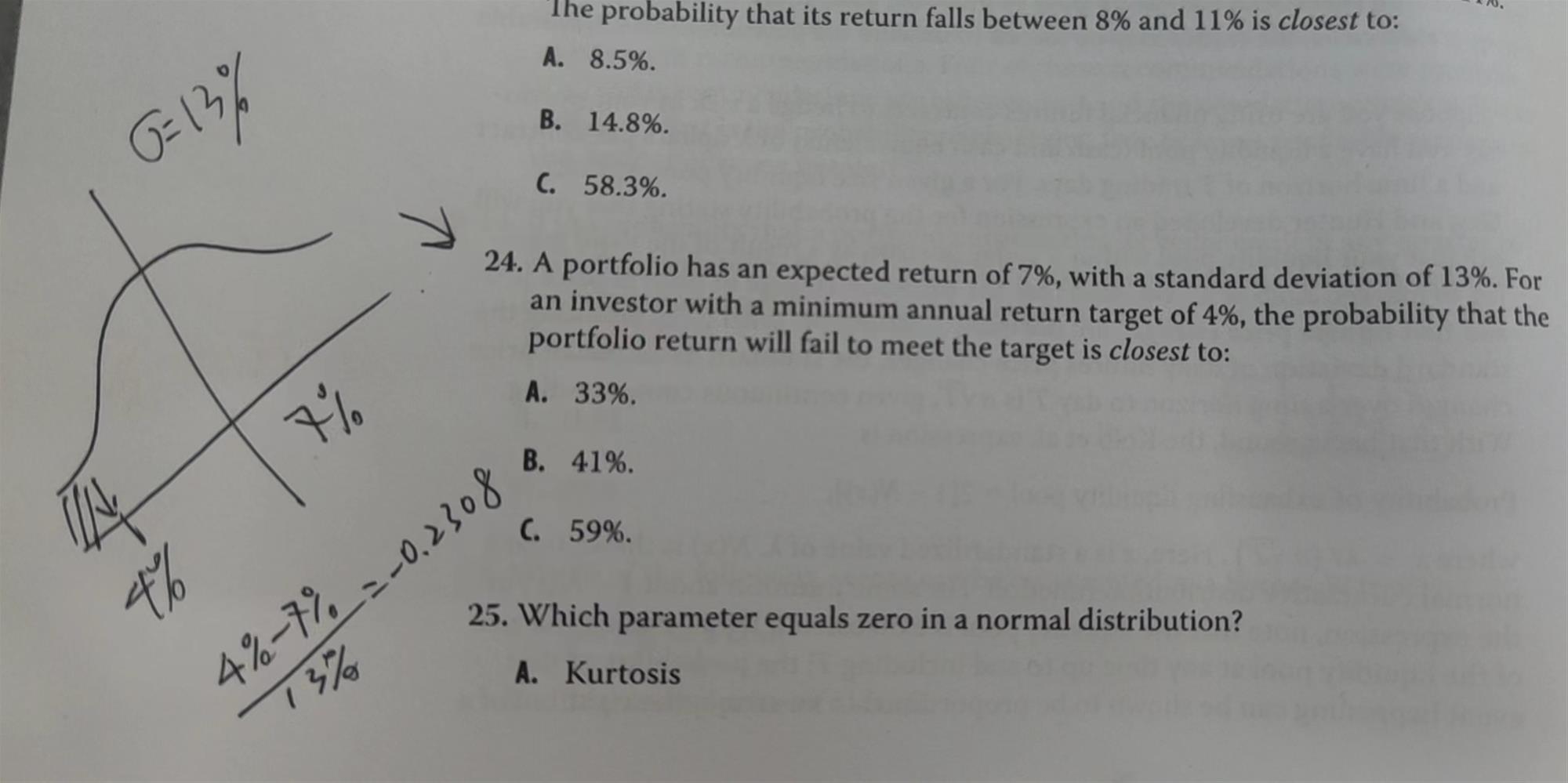 请见下图,求“-0.2308”就是在标准化,话句话说,题目中收益率分布的“4%”和标准正态分布的“-0.2308”具有相同的左尾面积