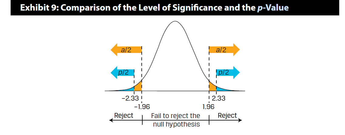 p-value和显著性水平的面积大小关系,此时蓝色p-value面积(对应±2.33)小于黄色alpha面积(对应±1.96)