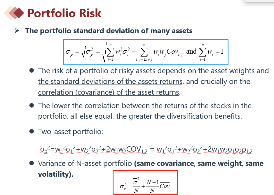 嗯嗯,是的,如果题目给的信息“投资组合中各个资产所占权重不相等”,答案依旧是A。如下图蓝色框所示,投资组合方差(或者标准差)不受到收益率影响