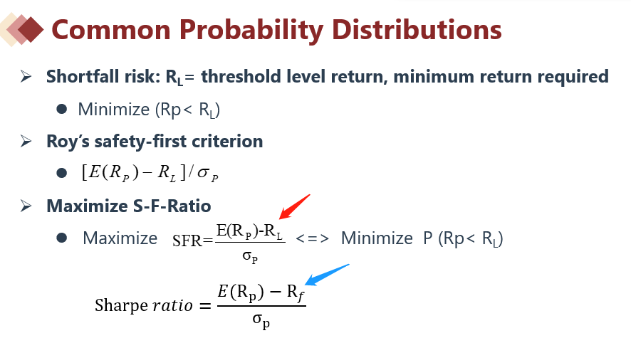 书P264-Example 7上方的最后一句话,When we evaluate portfolios using the Sharpe ratio, the portfolio with the highest Sharpe ratio is the one that minimizes the probability that portfolio return will be less than the risk-free rate (given a normality assumption). 如果portfolio return 小于the risk-free rate, 那么夏普比率的分子就变成负数了,那还怎么是minimize the probability? 并且,这个minimize the probability的夏普比率是the highest?