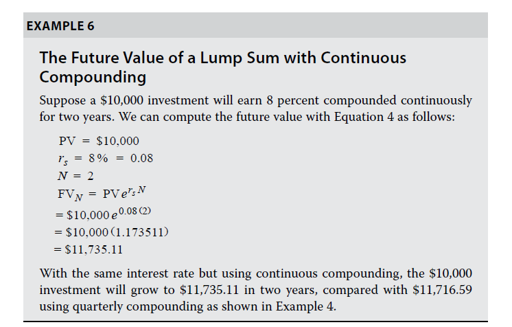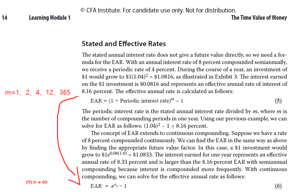 (1) 不太好区分“compounded countinuously连续复利”,以及“按一年N期复利”,这两个之间的“复利频率”怎么区别?换言之,书example 1和example 6的区别是? (2)example 1中,公式2不表示成您所解答的“按一年N期复利”,而是“按5年”考虑?