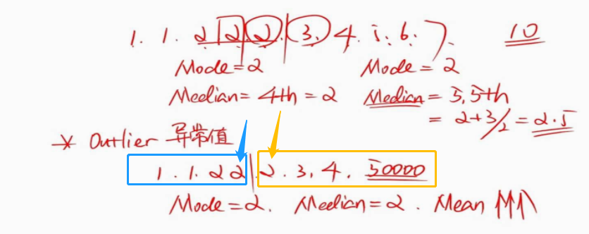 偶数个样本需要取中间两个数的均值作为中位数,例如以下截图中位数为2(蓝色和黄色箭头所指2+2=4,4/2=2)